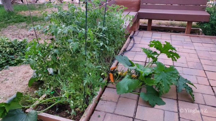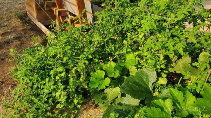 You see, I have kept the tomato plants in the other raised beds pruned, giving them drastic pruning every other week. Meanwhile, I’ve been mostly avoiding pruning this bed because if you can’t tell, there are 2 squash plants growing among the tomatoes – zucchini and yellow squash. If you haven’t dealt with squash plants before, let me tell you, it’s a pain to prune them. There are little hairs that sometimes feel like spikes on the stems that will make you say “ouch” even wearing gloves.