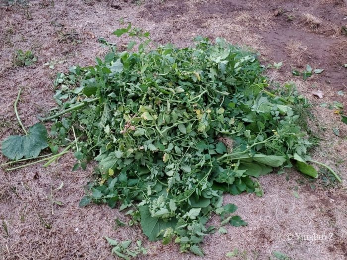 This is what I harvested from this bed. After pruning, I discovered there were actually a lot more unripe tomatoes than I initially thought. It just couldn’t be ripened because it couldn’t reach the sun due to dense foliage. Hopefully the pruning helped.