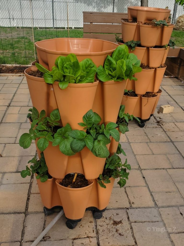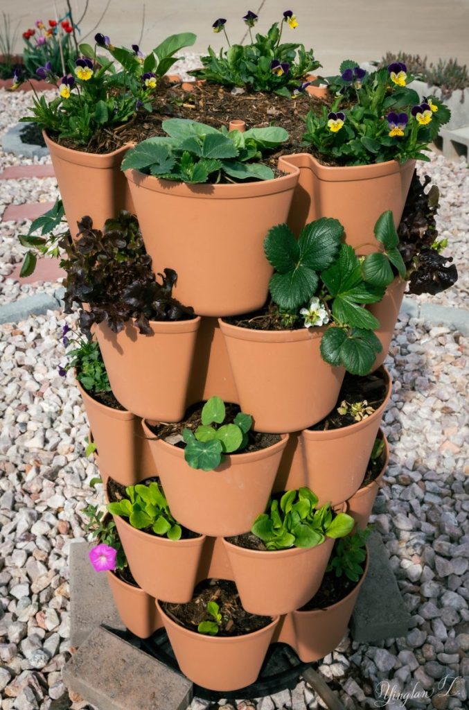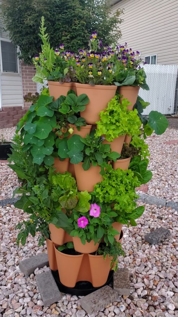 This is the tower in my front yard. I neglected to take pictures of it before I left on my trip. So all I have was the picture taken on May 4th, 2023 but just look at the growth, particularly on the violas and lettuces.