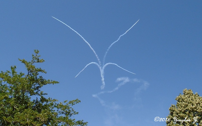 This was made by four different planes. I was so focused on snapping pictures that I didn’t catch how they did that. I did see the planes that separated at the top took a loop around the neighborhood before making another circle-like pattern in the sky.