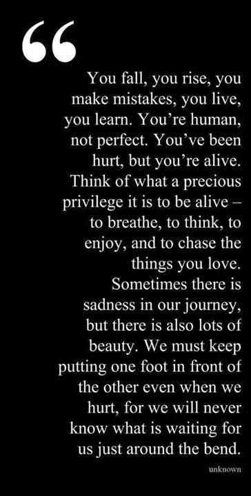 You fall, you rise, you make mistakes, you live, you learn. You’re human, not perfect. You’ve been hurt, but you’re alive. Think of what a precious privilege it is to be alive – to breathe, to think, to enjoy, and to chase the things you love. Sometimes there is sadness in our journey, but there is also lots of beauty. We must keep putting one foot in front of the other even when we hurt, for we will never know what is waiting for us just around the bend. – Unknown