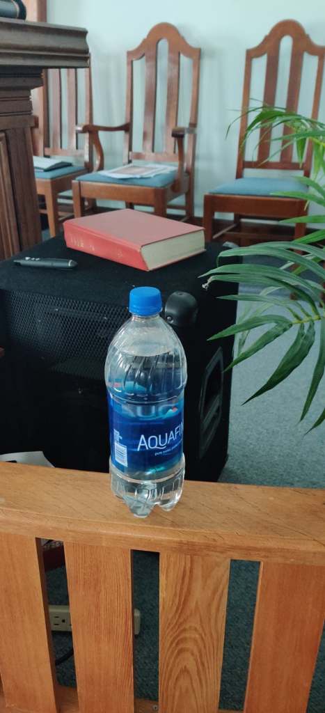 Staring at the bottle of water by the stage, he swallows as his mouth suddenly feels dry as a desert. Who the heck put that bottle of water there? Who’s this cruel?