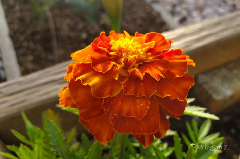 Below is a close up of a nearly spent marigold flower in my vegetable bed, where I hope will help me lure and keep the bugs away from my veggies as well as attract lots of pollinators.