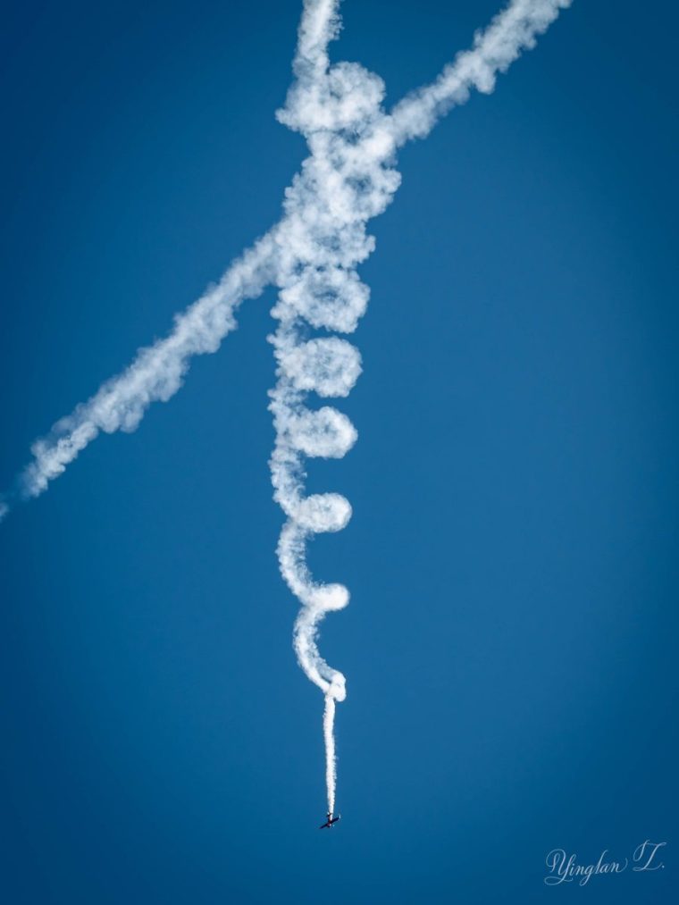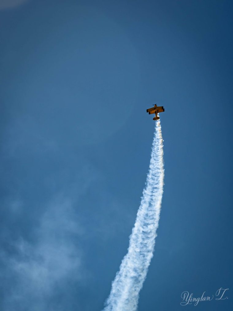 We decided let’s go watch the show for now, maybe watching the planes and taking pictures would make me more awake. Carefully maneuvering our way among the temporarily abandoned camping chairs, we found ourselves standing in the best spot to witness the show with nothing in our way. Once we found our spot, I turned my attention to the sky and there it was a yellow plane doing loops in the sky.