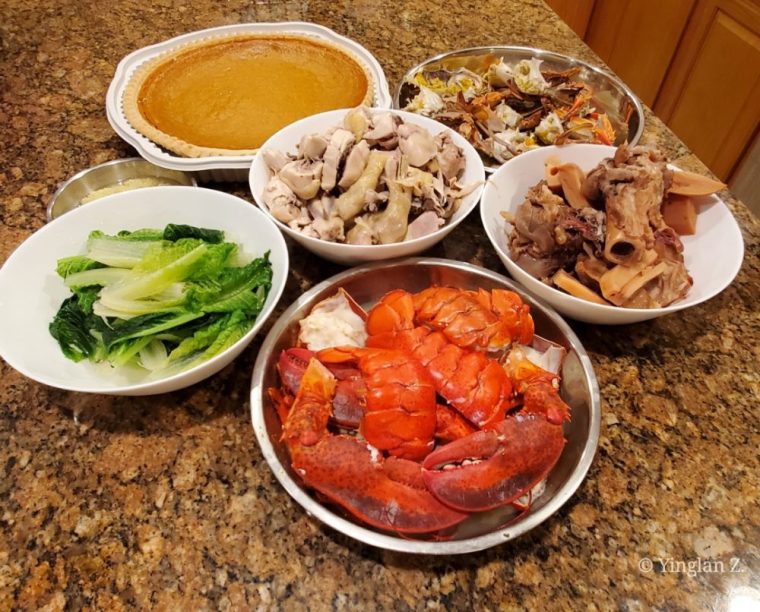 Like almost everyone else in the U.S on Thanksgiving, we had a Thanksgiving meal (a version of it, at least). The event was held at my aunt’s house and as usual, there was seafood but more surprisingly, there was turkey. The bowl to the right of the chicken, that’s the remnants of a turkey after being disintegrated in a pressure cooker.