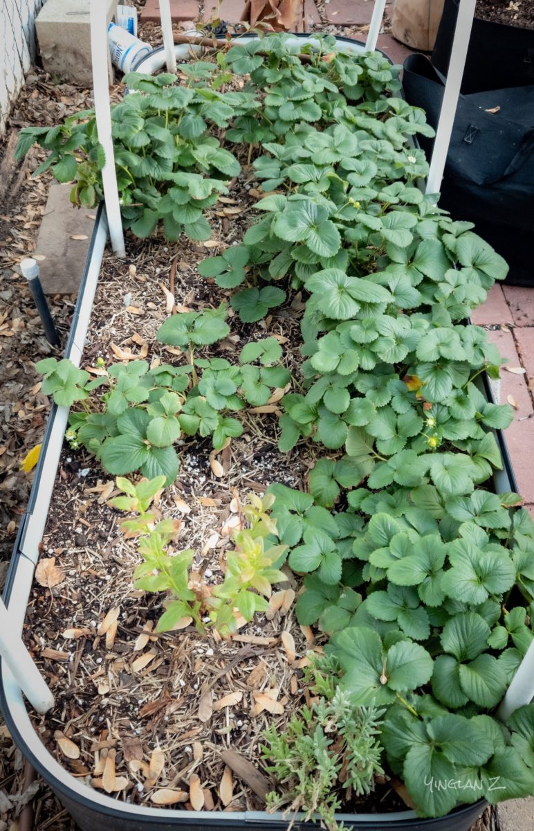 You probably don’t notice but I had to completely re-do the drip irrigation system in this bed. For some unknown reason, when I was amending this bed, I found the old irrigation tubing buried several inches deep. I even found parts of it below the strawberry plants, as if the plants were riding on the tubing. How did that happen?
