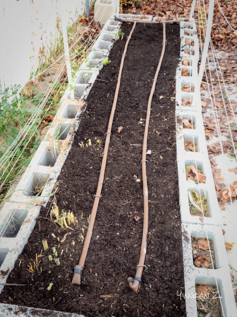 After finally installing the diverter, I had to give the garden a good clean up before I leave. I chopped the asparagus to the ground before dumping 2 bags of soil and leaves and mulch to let it rest for the winter.