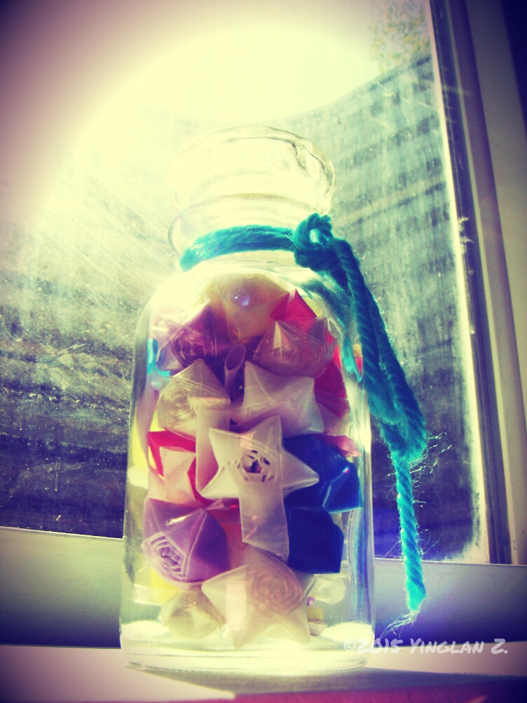 Finally, some of my first attempts at close-up photography. I have this jar of stars made from plastic straws. It’s been so long now that I can’t recall whether I made them all or just some of it. This jar of stars was a parting gift from my middle-school friend when I moved from California to Texas 10 years prior. It’s been 20 years now and this jar of stars is on the top shelf of my basement bookshelf.