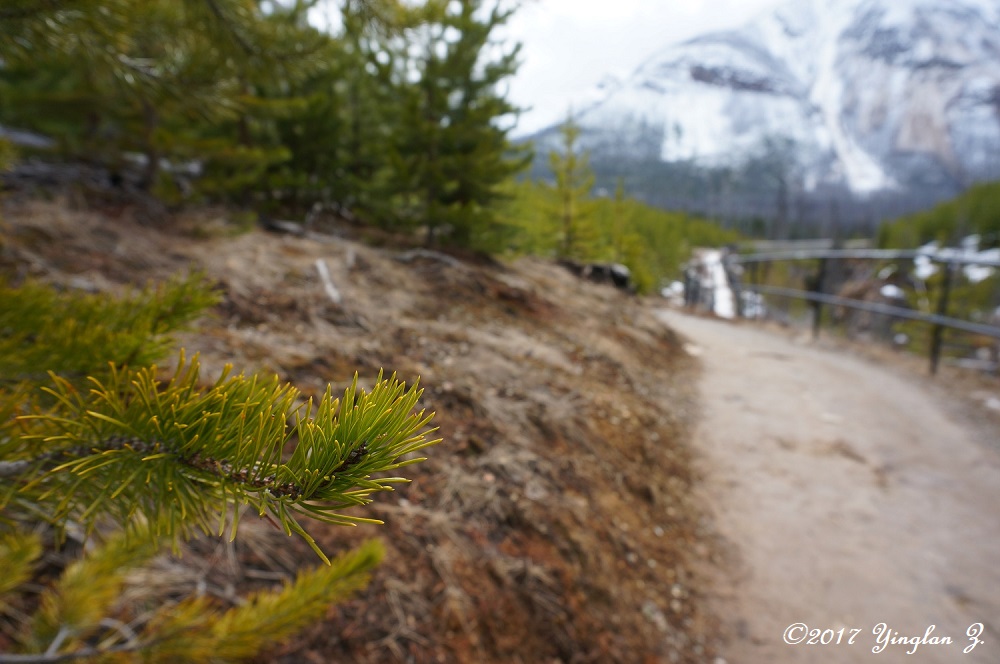 I briefly mentioned visiting the Natural Bridge in F for Field. I wrote that it was rainy and cold that day, the kind of weather that didn’t motivate us to want to go anywhere. However, what I didn’t mention was that the rain stopped for a brief moment while my aunt and I were at the Natural Bridge. The brief pause of rain allowed us to make our way to the other side of bridge, to get a closer shot of the Kicking Horse River as well as allowed me to capture shots of foliage and a guy photo-bombing my photo!