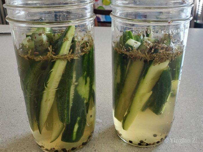 I finally got enough cucumbers to make myself two jars of pickles yesterday. These aren’t ready yet. They have to ferment in the fridge for 2 days. I can’t wait to try them. It’s my first time making pickles and my brine consists of apple-cider vinegar, white vinegar, water, sea salt, sugar, black and white peppercorns, and dried thyme. I hope it comes out okay.