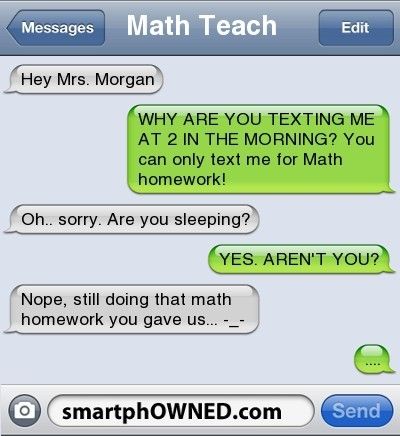 This used to happen to me a lot when I went to school in China – the doing homework ’til after midnight, not the texting teacher part. They haven’t invented texting yet. *sigh* I feel old now.